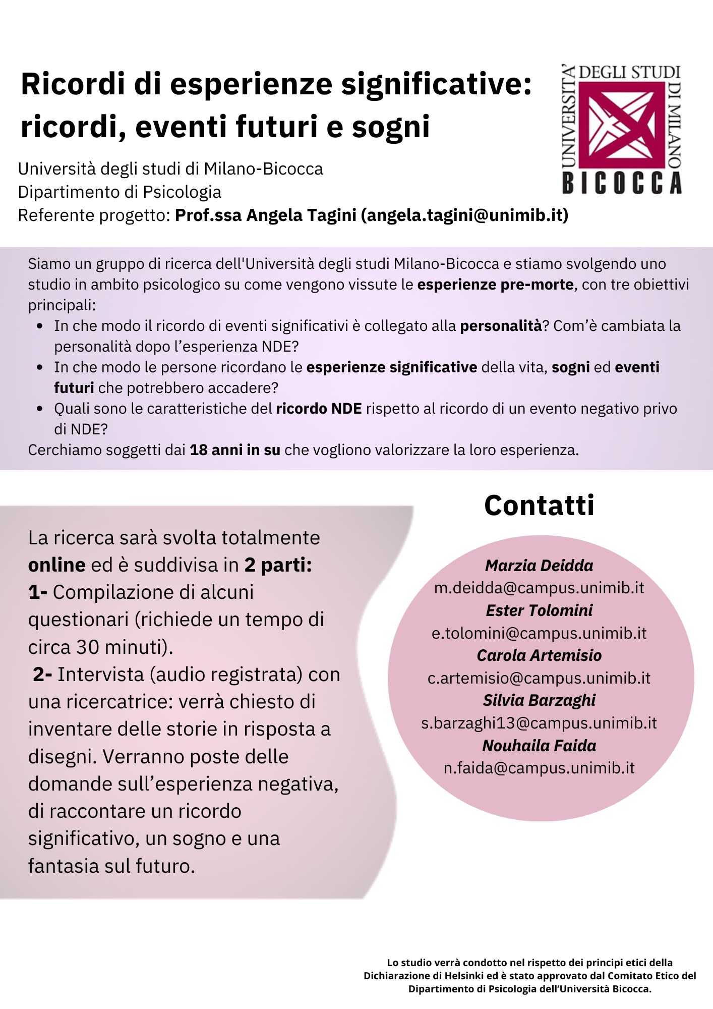 Gruppo di ricerca dell'Università degli studi Milano-Bicocca sta svolgendo uno studio in ambito psicologico su come vengono vissute le esperienze pre-morte, con tre obiettivi principali: